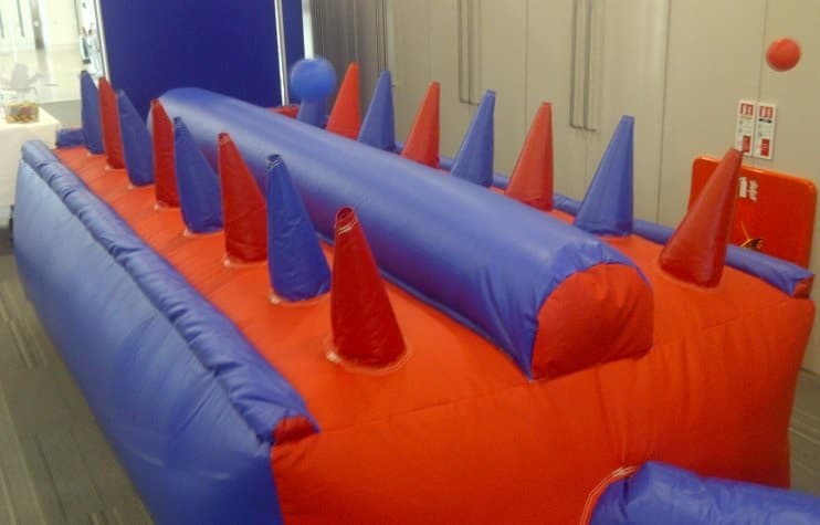 Along each side of the inflatable is a line of flexible cones with a vertical jet stream of air coming from each. The ball hovers in the air of the first cone and you have to move the ball along the line from jet stream to jet stream without dropping the ball until it reaches the other end.
