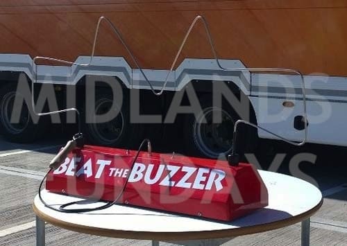 Giant Buzzwire game where the object is to move the wand from end of the wonky wire to the other without touching and making the buzzer sound.