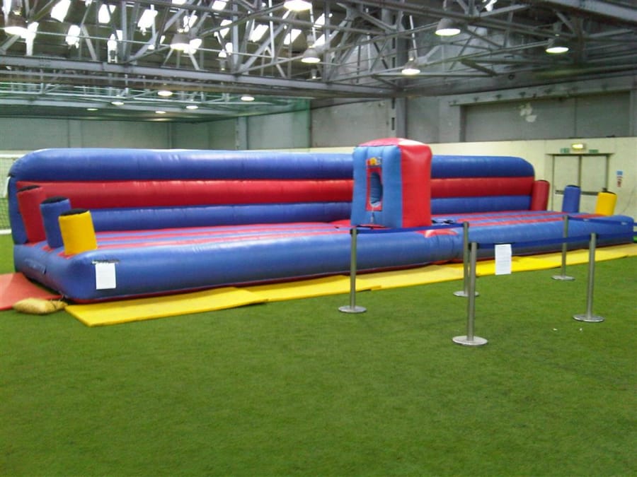 Both players start in the middle, either side of the inflatable wall, attached to opposite ends of the same stretchy bungee rope. On the start signal they have to race to place three velcro markers, one at a time, on to the colour co-ordinated pillars at the ends of the inflatable. This sounds simple enough but when your opponent is on the other end of the bungee rope trying to do the same thing in the other direction it's quite challenging and very amusing for those watching!